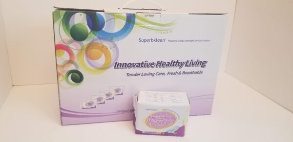 The box contains 18 packs of 8 overnight sanitary pads